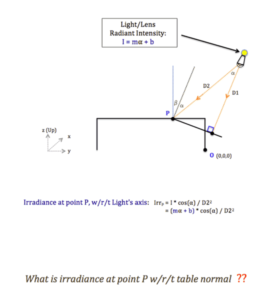 - One participant expresses confusion about calculating irradiance at off-angles and presents a drawing to illustrate their understanding and questions.