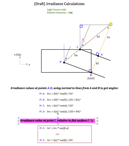- One participant presents two different approaches for calculating irradiance at point C, one based on the original irradiance calculation and another using a different angle for the cosine argument.