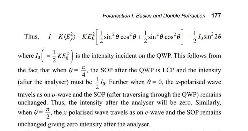 The Question is: A quarter-wave plate is rotated between two crossed polaroids. If an unpolarised beam is incident on the first polaroid, discuss the variation of intensity of the emergent beam as the quarter-wave plate is rotated. What will happen if we have a half-wave instead of a quarter-wave plate?