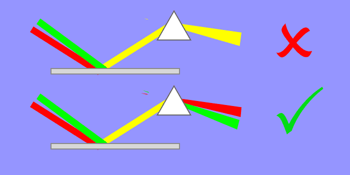 We can also sample the output of the prism at the angle about midway between where the green and red emerge, and there we will find yellow light at 600 nm. If we focus this onto a white sheet of paper, it is likely we can not tell the difference with our eyes between this and the green and red combination.