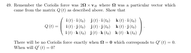 Although, our choice of the initial condition basis vectors for R is arbitrary, so how can we expect that R necessarily commutes with Q(t)? Unless of course, the question is asking for the matrix expression of Q(t) in the { i(t0) , j(t0) , k(t0) } basis. I am just wondering if I am to expect the matrix expression of Q(t) to remain invariant given any orthonormal basis of the same orientation?