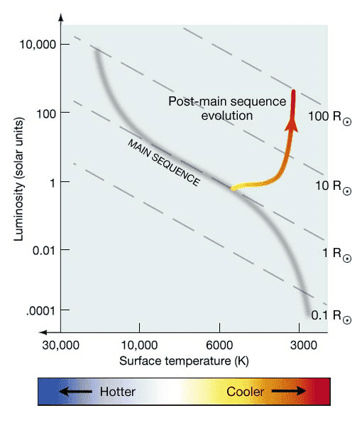 The path on an HR diagram after a star leaves the main sequence stage is known as post-main sequence evolution. In the graph, it consists of 2 parts: sub-giant branch and red giant branch. The near-horizontal is the former one, and the near-vertical is the latter one.
