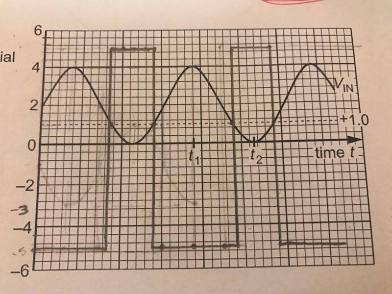 - Participants discuss the expected shape of the output graph and the significance of specific voltage levels, such as the saturation limit and threshold values. Questions arise regarding the configuration of the op-amp, the presence of feedback, and how to determine the output voltage based on input conditions.