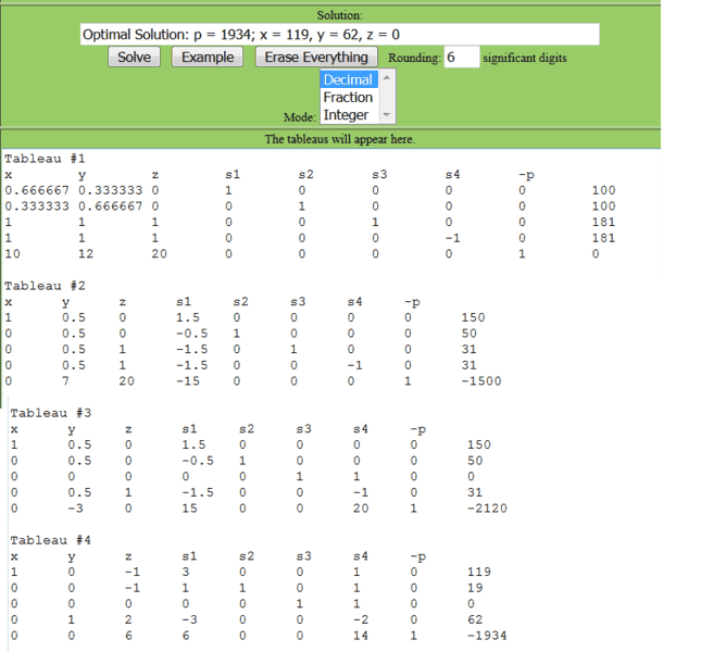 The first basic solution was obtained by letting s1, s2 and z be basic (and also Z, which is always kept basic). It happens to be feasible as well, but if some of the basic variables had come out < 0 we could have dealt with that. (Alternatively, I could have introduced and artificial variable "a" and written the third constraint as ##x+y+z+a=181##, then require that ##a \geq 0## come out as zero. That would be a two-phase approach, where Phase I is to minimize a, and if a comes out as zero, go on to Phase II (the actual optimzation), starting with the tableau/equations left at the end of Phase I. However, I did not bother with all that.)