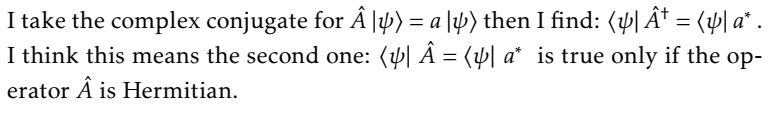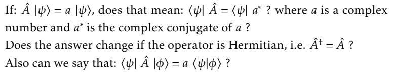 The discussion revolves around the application of operators in quantum mechanics using Dirac notation, specifically focusing on Hermitian operators and their properties. Participants express confusion regarding the implications of these properties and seek clarification on the relationships between operators and their eigenvalues.