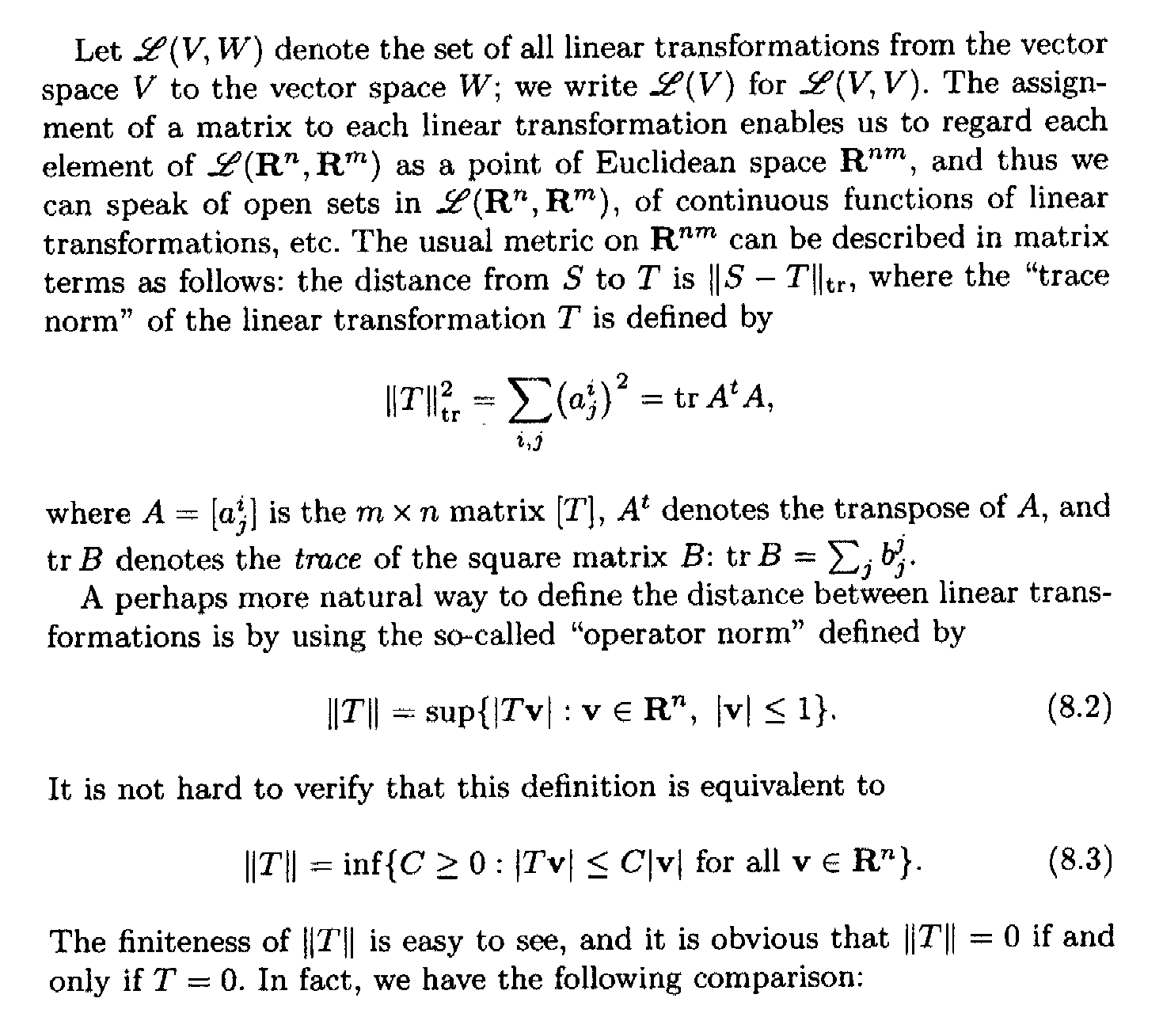 In the above text from Browder we read the following:" ... ... A perhaps more natural way to define the distance between linear transformations is by using the so-called "operator norm" defined by