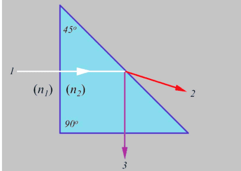 A ray of white light is incident on a 45o – 90o – 45o prism (ray 1 in the figure on the left). The prism is