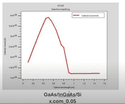 I am trying to obtain a plot of the photocurrent versus the wavelength of light of a GaAs/InGaAs/Si top-illuminated pin photodetector, where the doping ratio for p-type GaAs is conc=1e17, for i-layer In_xGa_1-xAs conc=1e14 and for n-type Si conc=1e18. Firstly, for x=0.05, if we illuminate this structure with top light, the plot of the photocurrent versus the wavelength of light we obtain is as follows: