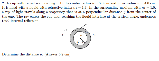 A cup with refractive index n2= 1.8 has outer radius b= 6.0 cm and inner radius a= 4.0 cm. It is filled with a liquid with refractive index n3= 1.3. In the surrounding medium with n1= 1.0, a ray of