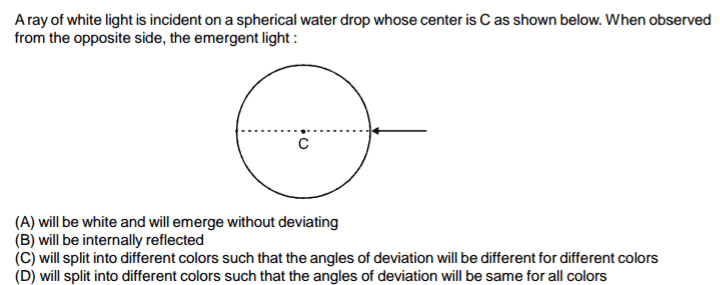 The discussion revolves around the behavior of white light as it interacts with a spherical water drop, particularly focusing on the concepts of deviation and dispersion of light. Participants are exploring how these phenomena differ from those observed with a triangular prism.