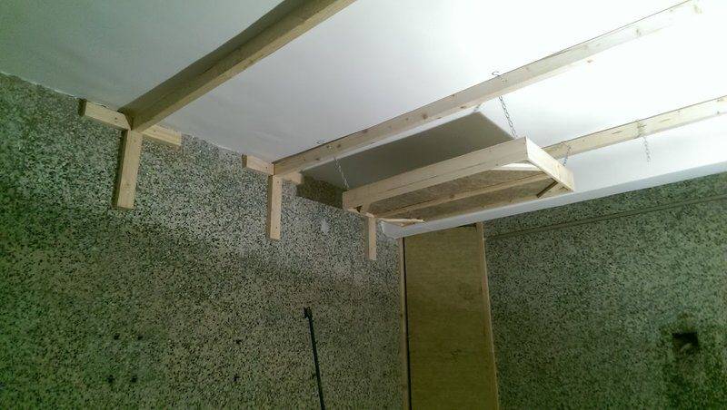 I'll screw in little hooks to each corner of the frame (4 hooks), and then hang the frame parallel to the ceiling (they will hang around 30 cm away from it). On the ceiling there are some wooden beams to which I will also screw hooks, and connect them with a chain to hooks on the corners of my panels.