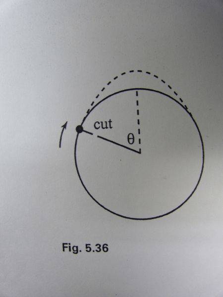 A mass is attached to one end of the massless string, the other and of which is attached to a foxed support. The mass swings around in a vertical circle as shown in Fig 5.36. Assuming that the mass has the minimum speed necessary at the top of the circle to keep the string from going slack, at what location should you cut the string so that the resulting projectile motion of the mass has its maximum height located directly above the center of the circle.