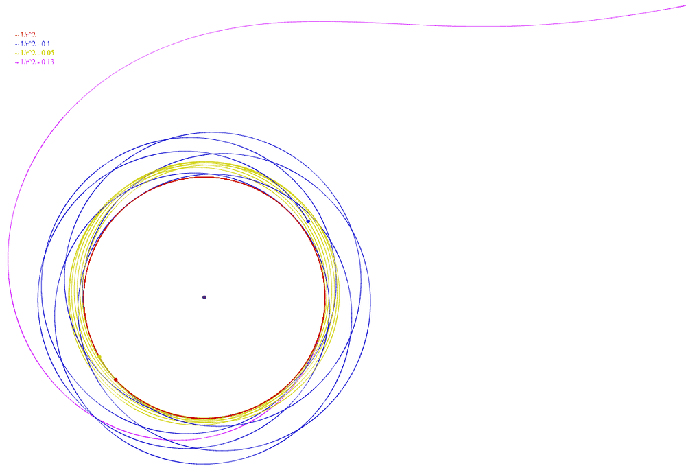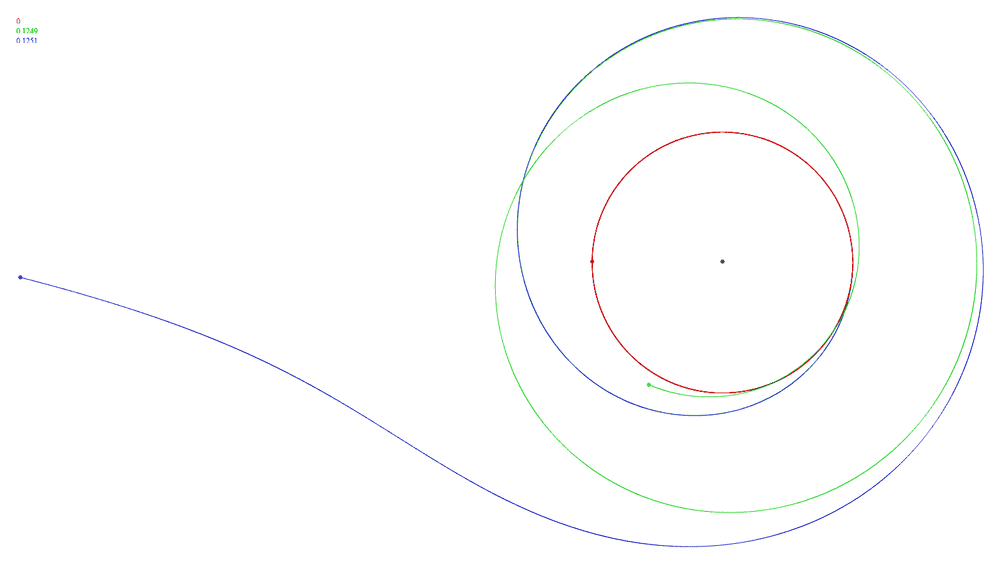 A quick test simulation gives me the following. The radial thrust is 0.05 (yellow), 0.1 (blue), 0.13 (pink) of the gravity at the initial circular orbit (red). Note that none of the trusted orbits goes below the initial radius.View attachment 276651