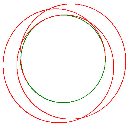 As I already expected the thrusted transfer (red) results in a new orbit (blue) with perigee below and apogee above the original circular orbit (green):