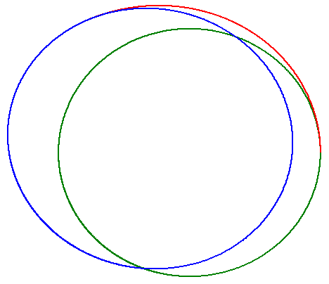 In case of a thrusted orbit (red) the radius of perigee and apogee remain constant but they are rotating around the center: