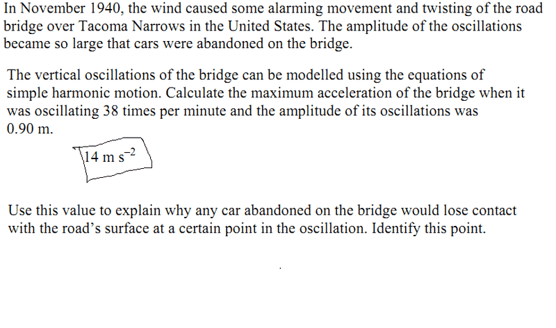 The discussion revolves around a physics problem related to oscillations, specifically focusing on a scenario where a car loses contact with a bridge. The context involves understanding the forces at play when the bridge is above equilibrium and how this affects the car's motion.