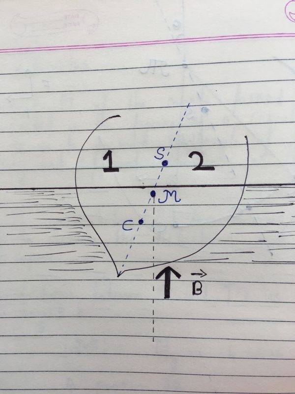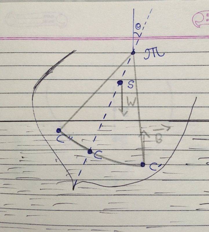 Now, my doubt is that it is written that if metacenter ##\mathscr{M}## were to lie below ##S## then the net moment produced would tend to increase the disturbance (that is it would tend to increase the angle with respect to the vertical, that is it would cause a rotation to the right) and I cannot understand how and why.