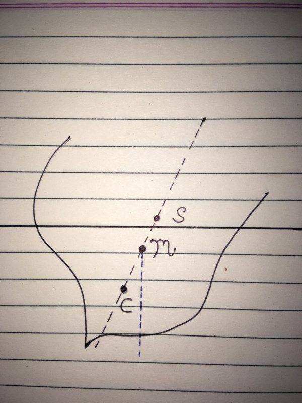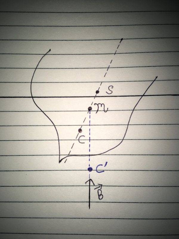 Now, imagine we rotate our boat (y-axis as the axis of rotation) towards right by some infinitesimal angle ##\theta## (with vertical), the new Center of Mass of displaced water is ##C’##. Rotate the boat (from equilibrium position) towards left by the same infinitesimal angle, the new Center of Mass of displaced water is ##C”##. Let ##\mathscr{M}## denote the Center of curvature of the curve ## C”~ C ~ C’##, let’s call it metacenter.