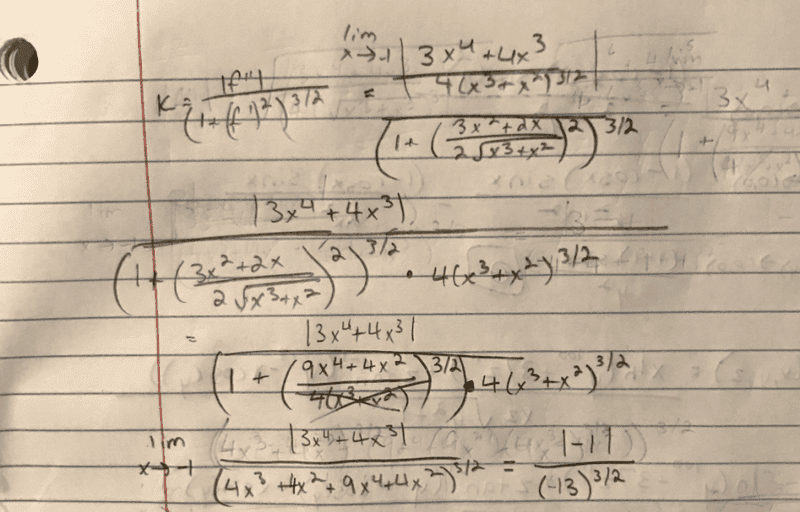 The discussion centers on solving for the curvature limit of an osculating circle using the curvature equation |f''| / [1-(f')^2]^(3/2). The user attempts to evaluate the limit as it approaches -1 but encounters confusion regarding the expected result of 2. The calculations presented yield |-1| / (13)^(3/2), indicating a misunderstanding in the application of the limit process or the curvature formula.