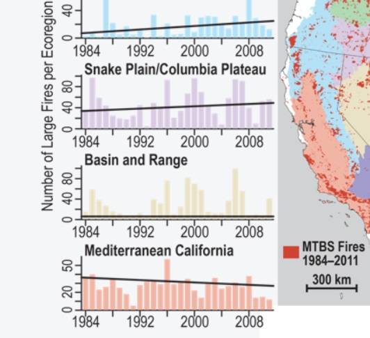 From the first link, the trend (1984 - 2011) in "Mediterranean California" (the coast including the Los Angeles basin) is fewer large fires. It would be nice to have more up to date data like this.