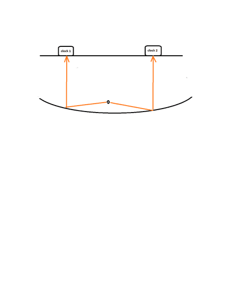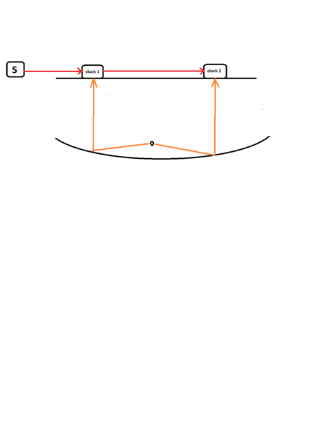 So, I thought of the light emitted from a source, placed at the focus point of a parabolic mirror reflecting towards two clocks that are horizontally spaced at distance x, and parallel to the mirror.