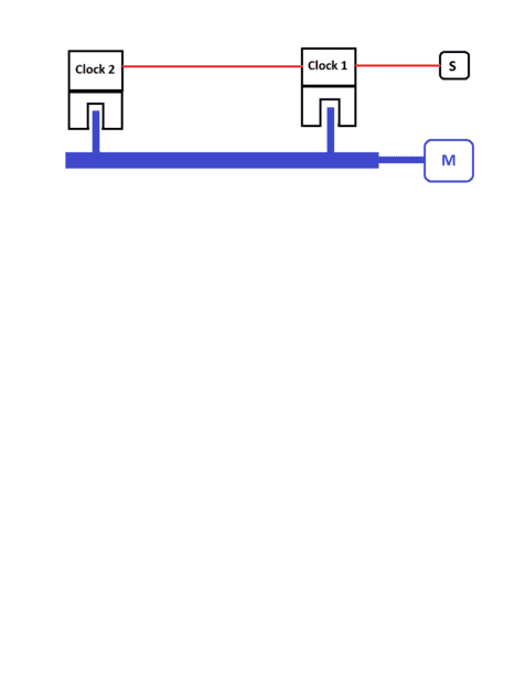 Both clocks are initialized and on standby, the source emits a pulse towards the clocks, after some time reaching and starting Clock 1 en route for Clock 2, and starting it after some time.