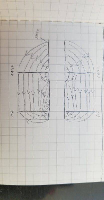 My question is: how can the liberated electrons be managed. I assume if they are not removed, they will distribute them selves over the walls of the ceramic tube and possibly interfere with the electric field used to accelerate the protons. Would it be practical to use an electrode connected to a capacitor connected to the 10 kV plate to drain the electrons from the system (see "With Electrode.jpg"). Assume the electrode is at a potential slightly higher than the 10 kV plate and the capacitor has a capacitance of slightly more than the charge carried by the liberated electrons.