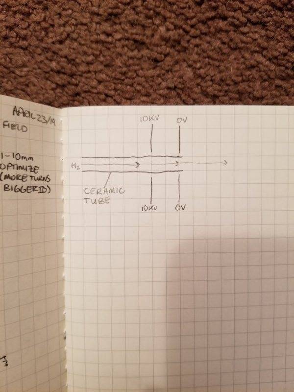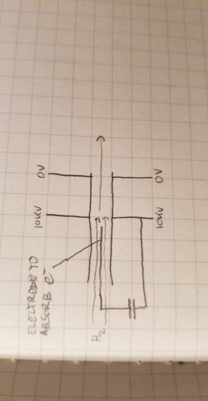 I am trying to come up with a design for a device with which to generate a rapidly pulsed proton beam (on the order of 1 pulse per ms). My thought was to apply a 10 kV potential between two parallel plates (each with a hole in their center) and inject a steady stream of hydrogen gas through the parallel plate system with the gas contained within a ceramic tube inserted through the holes of the parallel plates (see "No Electrode.jpg" below). The gas travels from left to right and would be ionized some how (either via an electron beam knocking electrons off the atoms or via the use of ionizing radiation) right after it passes the 10 kV plate, causing the hydrogen to be separated into electrons and protons. The protons would be accelerated to the right and the electrons would be accelerated to the left (albeit not for very long as they would be quite close to the 10 kV plate upon their formation).
