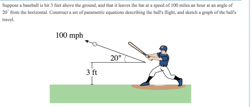 Suppose a baseball is hit 3 feet above the ground, and that it leaves the bat at a speed of 100 miles an hour at an angle of 20° from the horizontal.