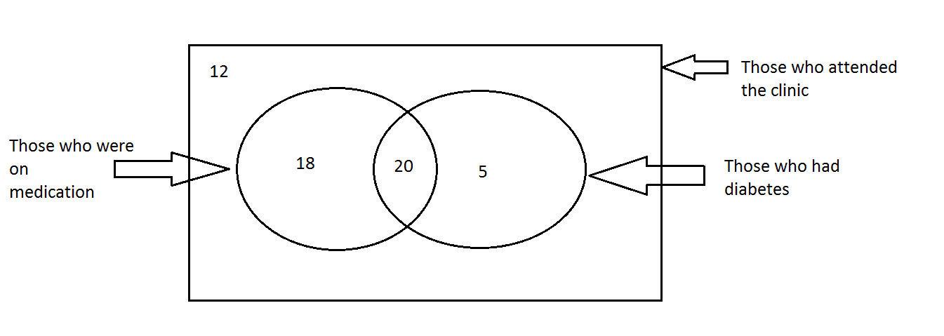 Among the 40 persons who visited the clinic , there were persons who were on medication and those who were not on medication as well. An incomplete Venn diagram drawn using this information is shown below