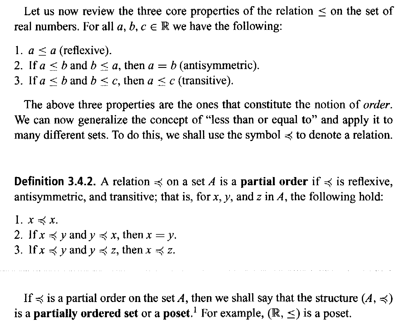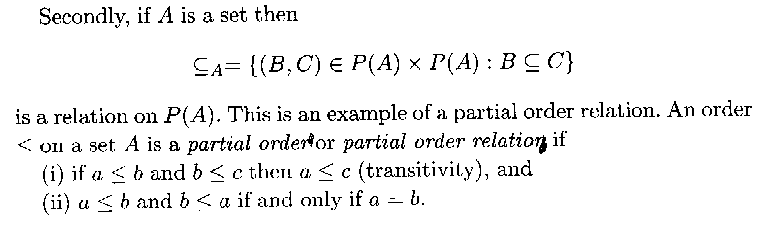 View attachment 9029Garling thus defines a partial order relation as possessing transitivity and anti-symmetry ... but a number of other authors define a partial order as having the property of reflexivity as well ...