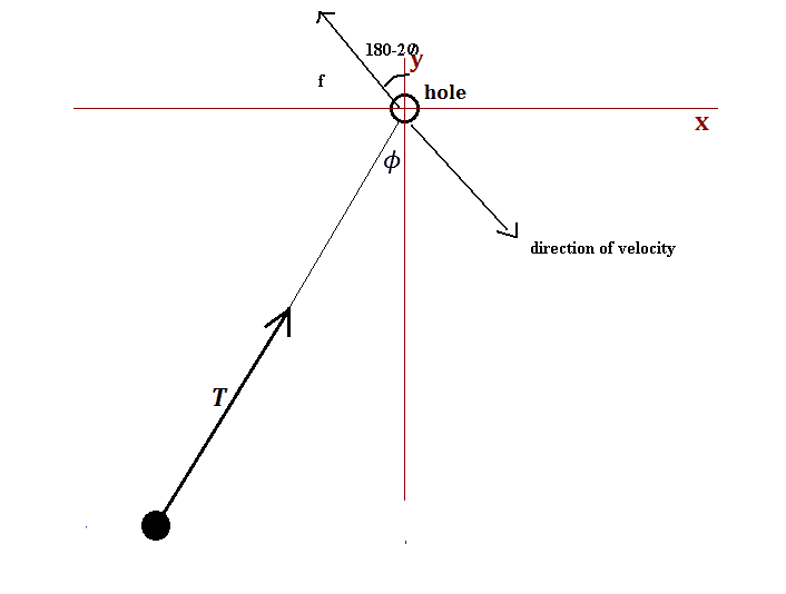 So I think you have the correct angle for the direction of motion of the particle. Let ##r## be the length of the string between the particle and the hole. You want to find the path of the particle. In polar coordinates, this would be ##r## as a function ##\phi##.
