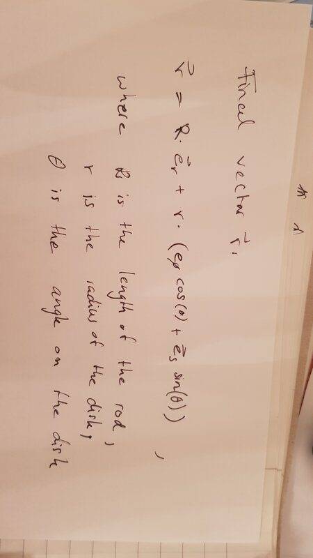 I would express the pendulum motion in form of polar coordinates with corresponding unit vectors in the x-z-plane (view images, ignore the german, sorry). How would you now bring in the circular movement, which is constantly changing its plane? Is it enough to simply add the representation of a circular path in the x-y plane to the equation underneath? That wouldn't take into account the constant "switching" planes, but rather assume that the circular disk is constantly parallel to the x-y plane, right? Unfortunately, I'm still a high school student, so I really don't know how to proceed from there. Many thanks for your help!