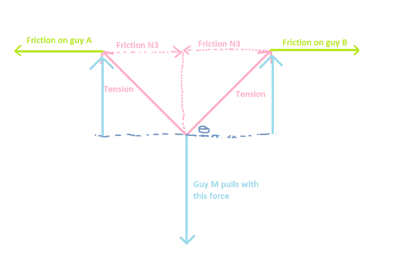 Now, let's say that a third person joins the party and grabs the rope right between them and wants to pull it in direction perpendicular to the rope.