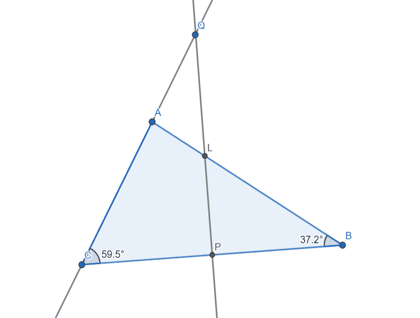 - ##ABC## is a triangle such that ##\angle ABC = 37^{\circ}15'##, ##\angle ACB = 59^{\circ}40'##, ##BC = 8## cm; the perpendicular bisector of ##BC## cuts ##BA##, ##CA## produced at ##P, \ Q##. Find the length of ##PQ##.