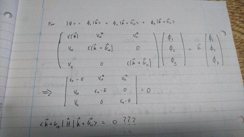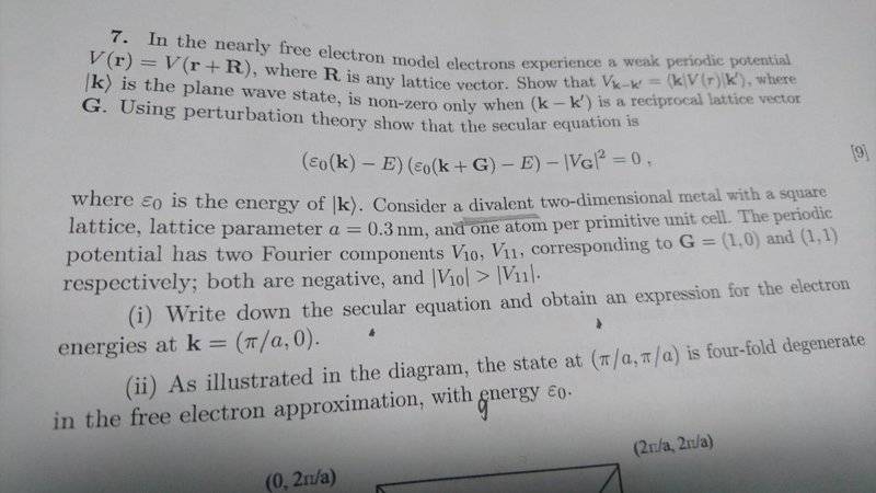Please see attached file (question also attached (part (i). I believe this is wrong but I cannot see what the expectation of the potential between the two final states can be other than zero (as they are separated by a reciprocal lattice vector (0,1).