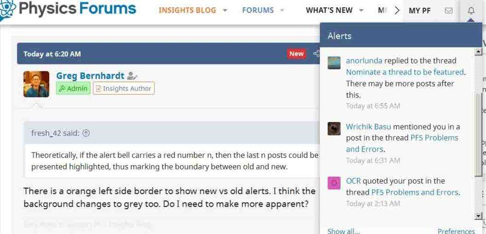 I think the confusion is another. The orange bar is ok for one or two threads, but not for 20. I (we?) used to click on alert to see the list and then proceed bottom - top to check what we have missed while away.Greg Bernhardt said:There is a orange left side border to show new vs old alerts. I think the background changes to grey too. Do I need to make more apparent?
