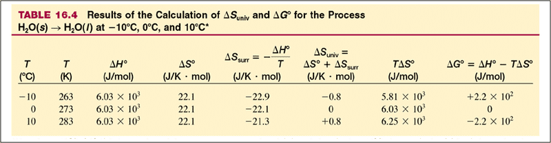We know that if a mole of ice at 273K melts, the entropy change would be ΔS=ΔHf/T=6030/273=22.1J/K, we compare this to ΔSsurr and we find that their sum (ΔSuni) is 0.