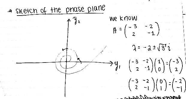 The discussion revolves around the interpretation of a phase plane diagram involving complex eigenvalues, specifically focusing on the direction of spirals (clockwise or counterclockwise) and the behavior of solutions in relation to the center of the phase plane.