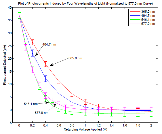 My question is: under what theoretical assymptions and explanations is ##(1)## suitable to calculate ##h## (i.e. when to determine ##V_0##, even if current does not go asymptitically to zero but becomes negative, is still a good method to determine $h$ using ##(1)##)?