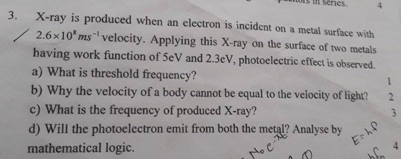 - The original poster attempts to apply energy equations related to the photoelectric effect but expresses uncertainty about the next steps. Participants question the clarity of the original post and suggest that the question may be confusing due to language barriers. There is a discussion about the energy equation and its application to the problem, particularly regarding the frequency of the X-ray and its ability to liberate electrons from the metals based on their work functions.