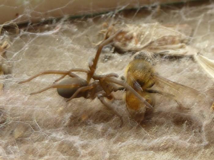 This is the story of 2 bees entering my appartment today. One flew away while the other had to fight against my girlfriend who eventually hurted it. It felt down at the bottom of our window, not the best spot. Right over a spider net. After a few seconds a spider poped up, wrapped its prey with its silk rope. The spider then took the prey inside its nest to devore it, outside my viewfield.