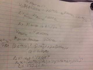 What acceleration does Marcus feel and how long does Marcus travel with the details: Marcos and Melissa are driving. Marcus's car travels 21 m/s and Melissa's travels 25 m/s. Marcus's car is 200 m behind Melissa's car when he hits the gas, giving constant acceleration. Marcus overtakes 12 sec?