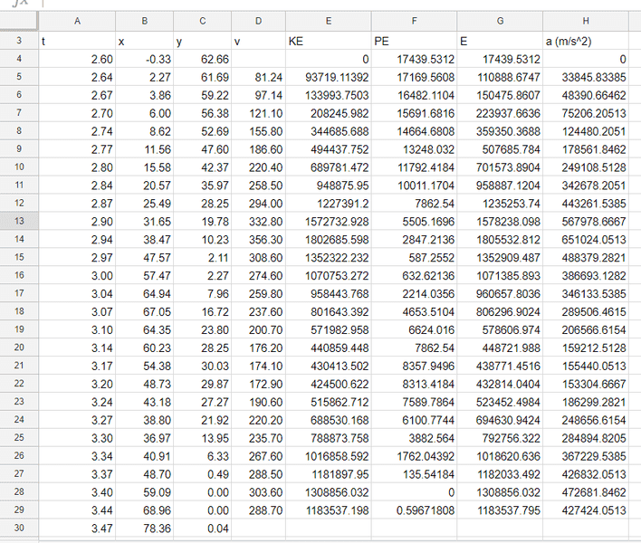 Hi guys, currently trying to figure out part of my lab for Physics I. We used the program Tracker to gather information on a metal ball rolling down a metal track and through a loop. The origin was set at the bottom perpendicular to the top of the angled track where x and y = 0. Here is the data I gathered: