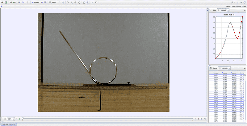 Obviously to calculate the KE and PE I have been using 1/2mv2 and mgh. The ball weighs about 28.4 grams. However, I have been getting some pretty strange KE and PE numbers that don't follow the conservation of energy. I think what is tripping me up is that the ball at first rolls down an angled track and then enters circular motion. I also suspect that Tracker did not calculate the velocity correctly (those numbers seem odd to me). I am supposed to calculate the normal force acting on the ball at the bottom and top of the loop.