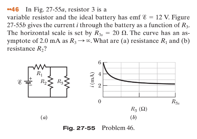 I did manage to solve it by using R3= 0 and thus finding R1= 2000 by using Ohm's Rules, then, using R3 going towards infinity, I find R23= R2, and from that I find R2 + R1= 6000. Since R1= 2000, R2= 4000, which is the correct answer. However, when I tried solving by using the point(5, 0.003) from the graph, I have the equation: R1 + (5R2/5+ R2) = 4000. Using R1 = 6000- R2 I get R2^2 -2000R2 - 10000=0. The positive root is 2000. That makes no sense since it inverts R1 and R2. Could someone tell me why it doesn't if I use that point?