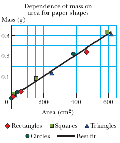 A student is supplied with a stack of copy paper, ruler, compass, scissors, and a sensitive balance. He cuts out various shapes in various sizes, calculates their areas, measures their masses and prepares the graph in the figure below.