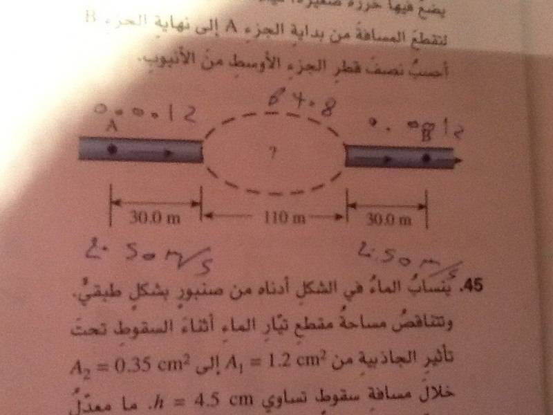 The following image shows the parts A and B of a pipe where the middle part goes under a hill the length of both parts A and B is 30m and the diameter of them each is 2cm where as the middle part has a length of 110m to determine the middle part's diameter one engineer decided to push water in the pipe with a speed of 2.50 m\s in part A he dropped a small coin in the flow and noticed that it took 88.8 seconds for it to start from A and exit from B.