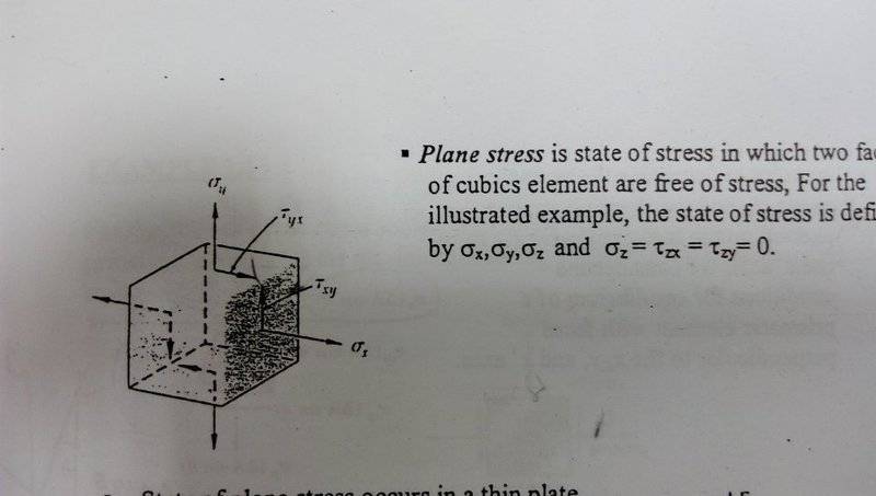 Plane stress is a state of stress applicable to thin objects where two surfaces are free of stress, specifically in the context of a 3D cubic element. In this scenario, only the stresses in the XY plane are considered due to the object's thinness, effectively reducing the analysis to two dimensions. The discussion clarifies that the original statement regarding the cubic element should specify that four surfaces are free of stress, as only two planes are relevant for stress analysis.