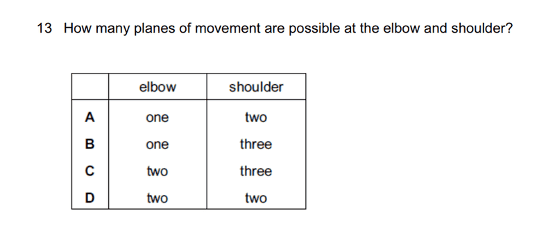 This is an olevel question from paper 5090 may/june 2012 paper 12 question number 24 (the snapshot is from another question paper) the answer in the marking scheme is A which clearly I cannot understand. I thought shoulder joints have 3 planes of movement